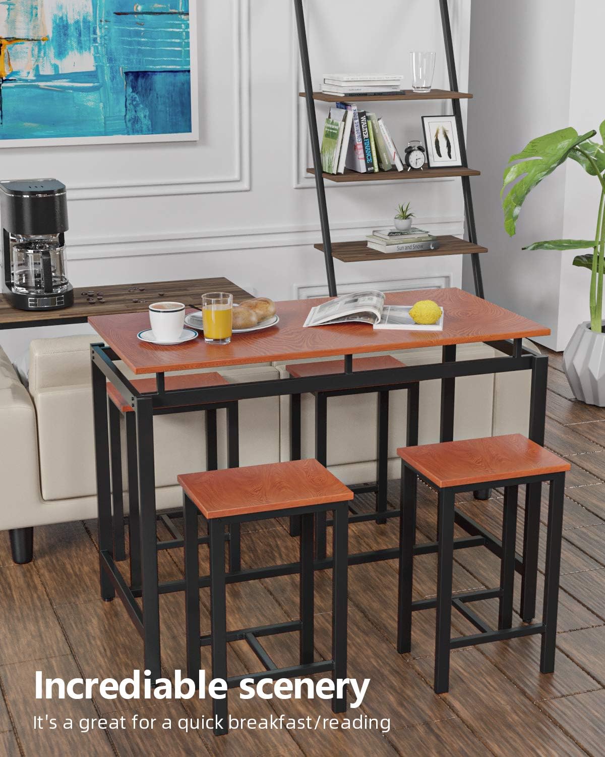 Our bar table set is sold with a counter height table and 2 pub chairs, so just invite your friend to join your dining time.